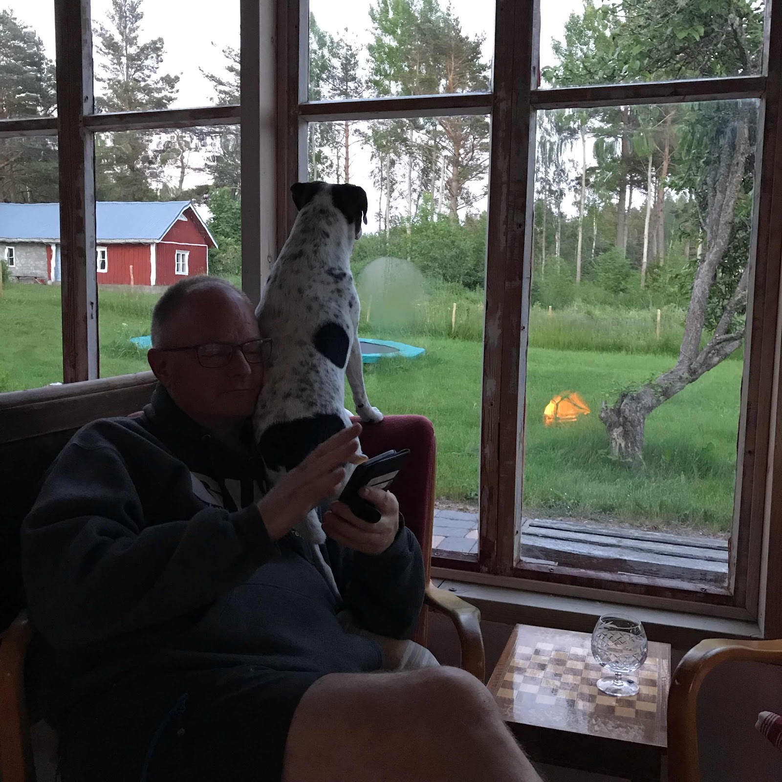 Nåväl. Hunden spanar rådjur genom alla fönster han kan se ut genom. Jag hanterar åtminstone min rastlöshet bättre än så. Bok och torkade dadlar med lakritssmak.