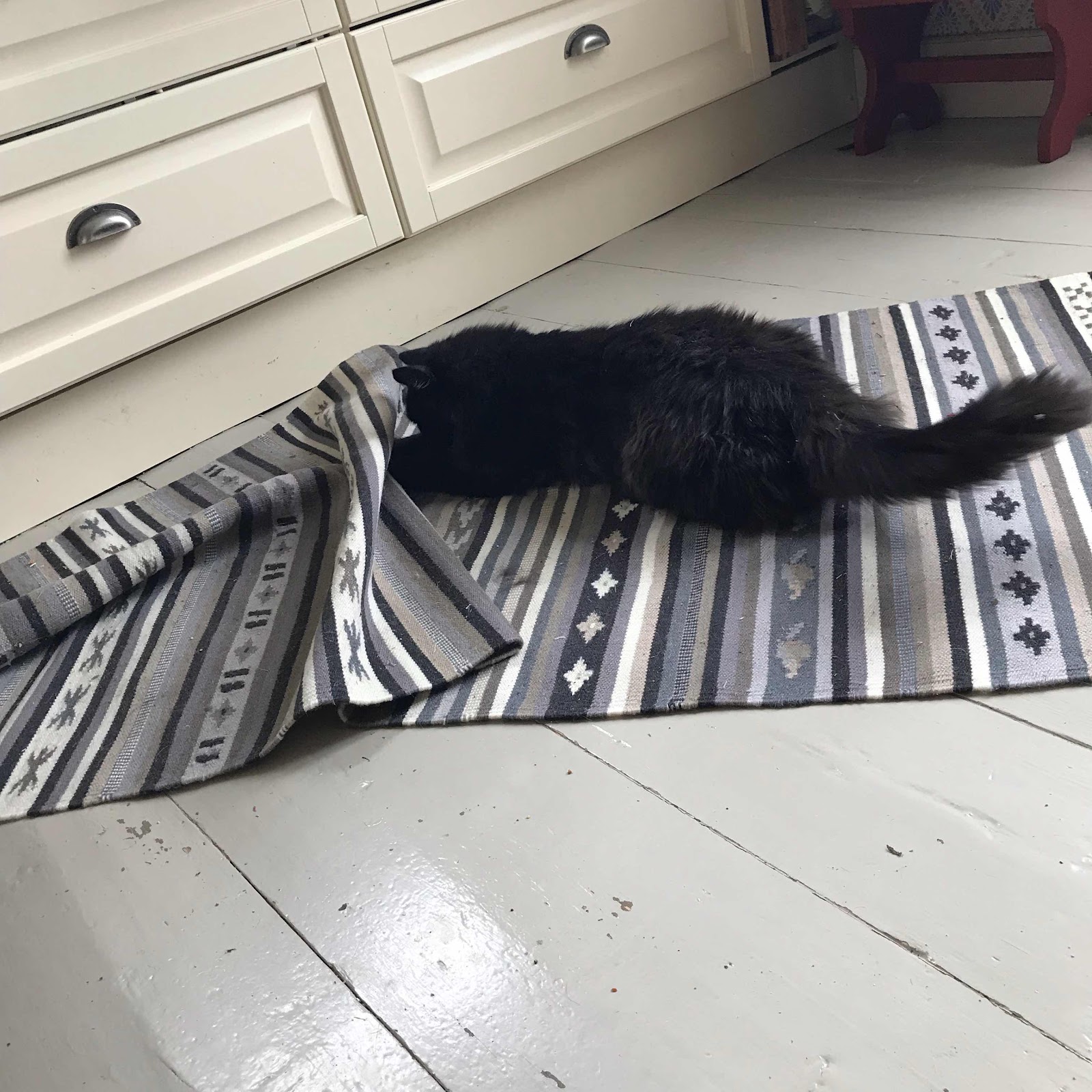 Vi har nya köksmattor på Fridhem. Måste sätta sånadär säkerhetsgrejer under dom, tror jag. Inte för att tvåbeningarna halkar särskilt mycket, men för att gammelkatten tycker det är vansinnigt roligt att skrämma in mattan i ett hörn innan han dödar den.