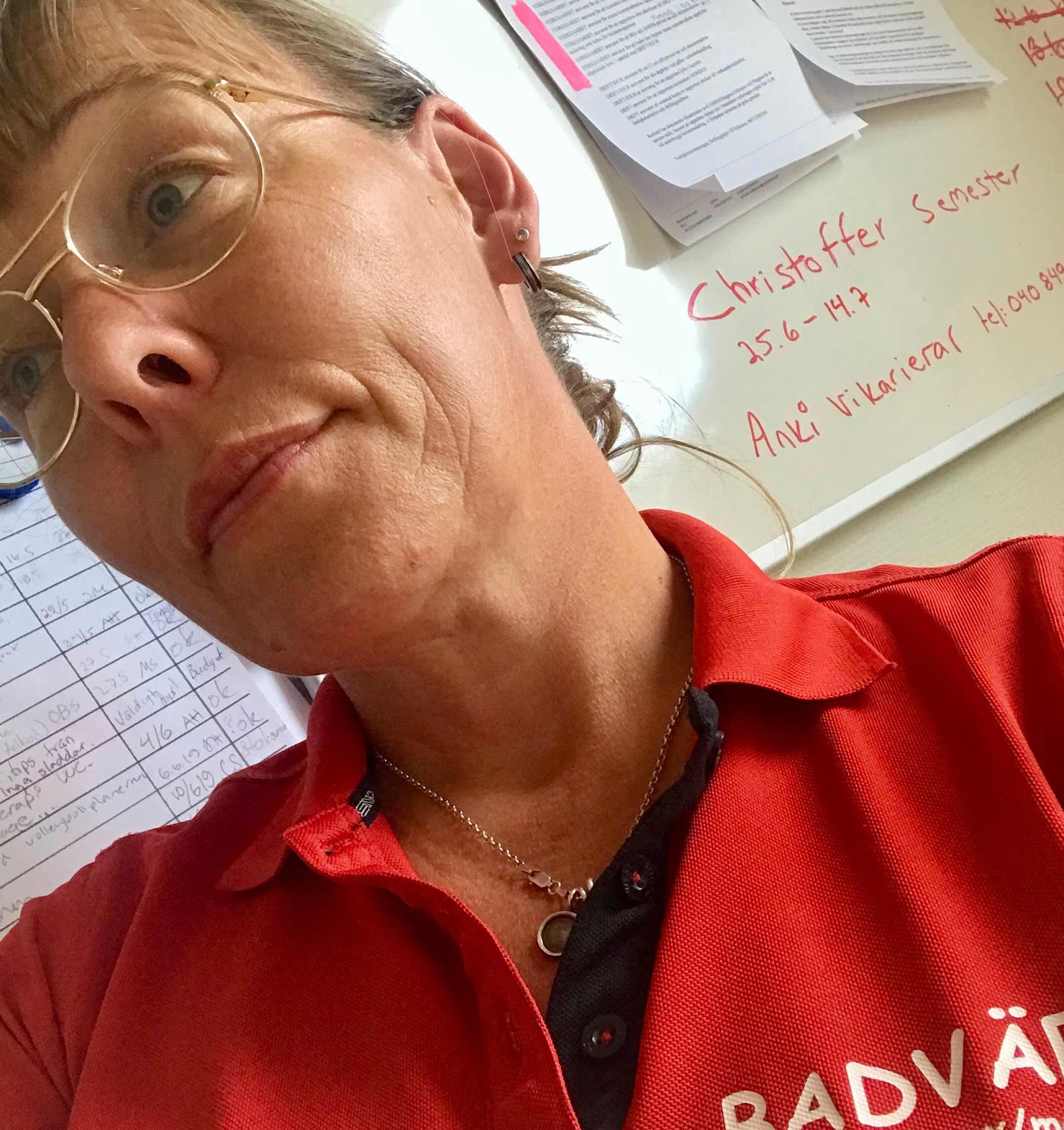 Jag har tvättat fönster och städat många golv, och tvättat minst fem maskiner tvätt (men det är ju precis som hemma) och vikt femtio rena handdukar (som hemma...) och vaktat rutchkanan i lilla bassängen. Och städat ett torn med vattenslang så jag blev alldeles blöt.