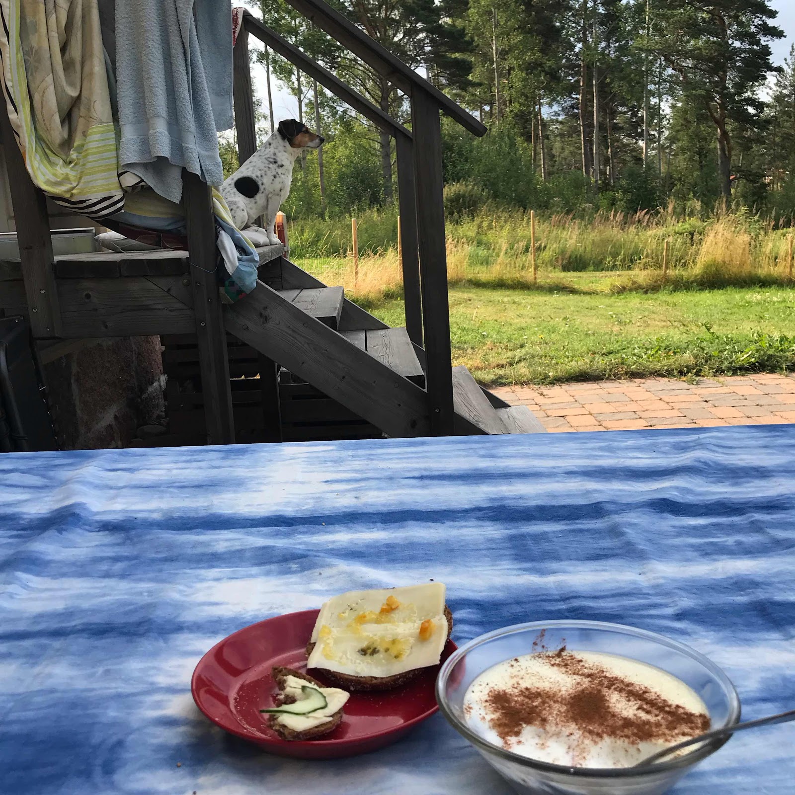 Äter frukost på altanen