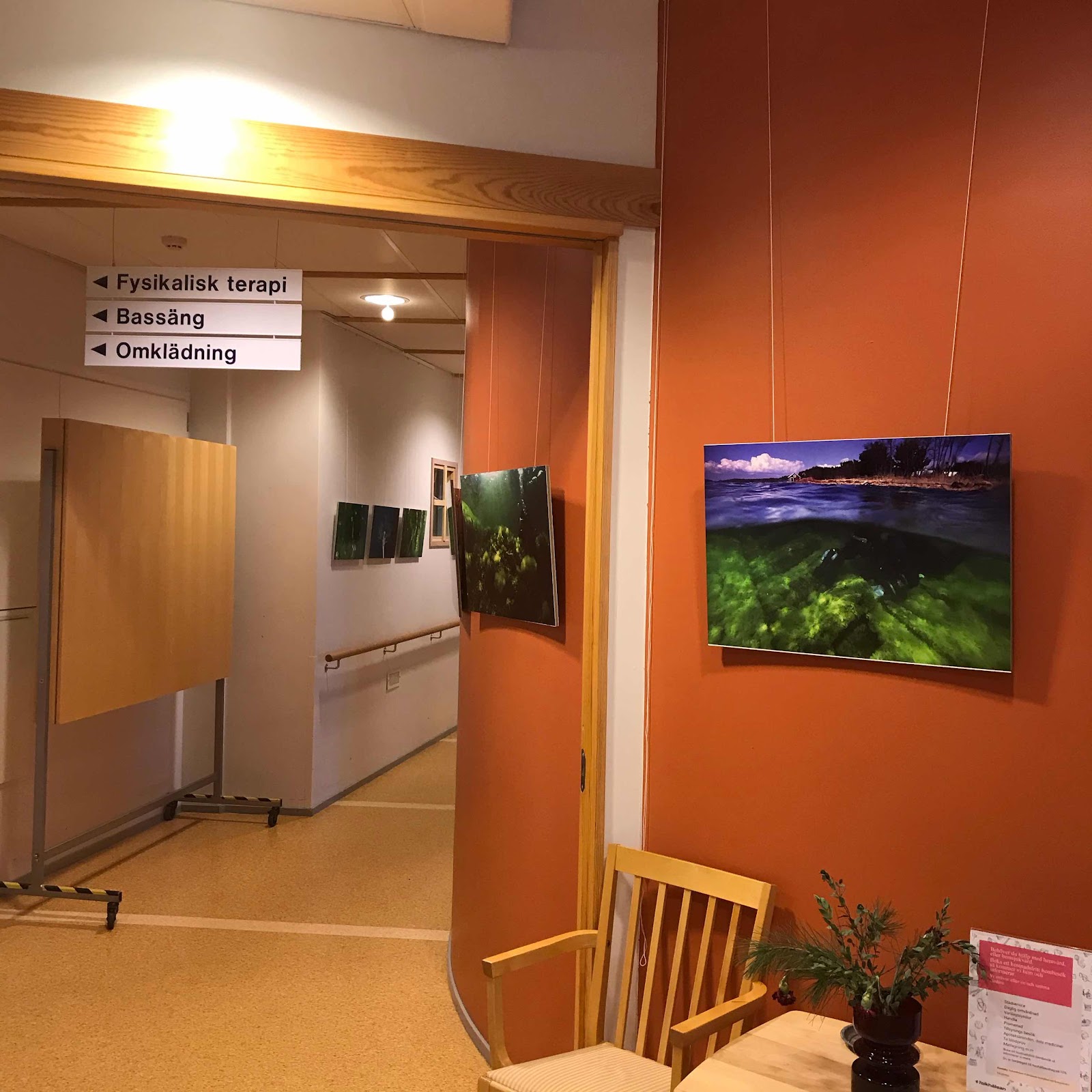 Vi hann faktiskt hänga en utställning också. I förmiddags. M’s undervattensbilder, förstås, på mitt jobb där det finns några väggar att ha utställning på. Kul!