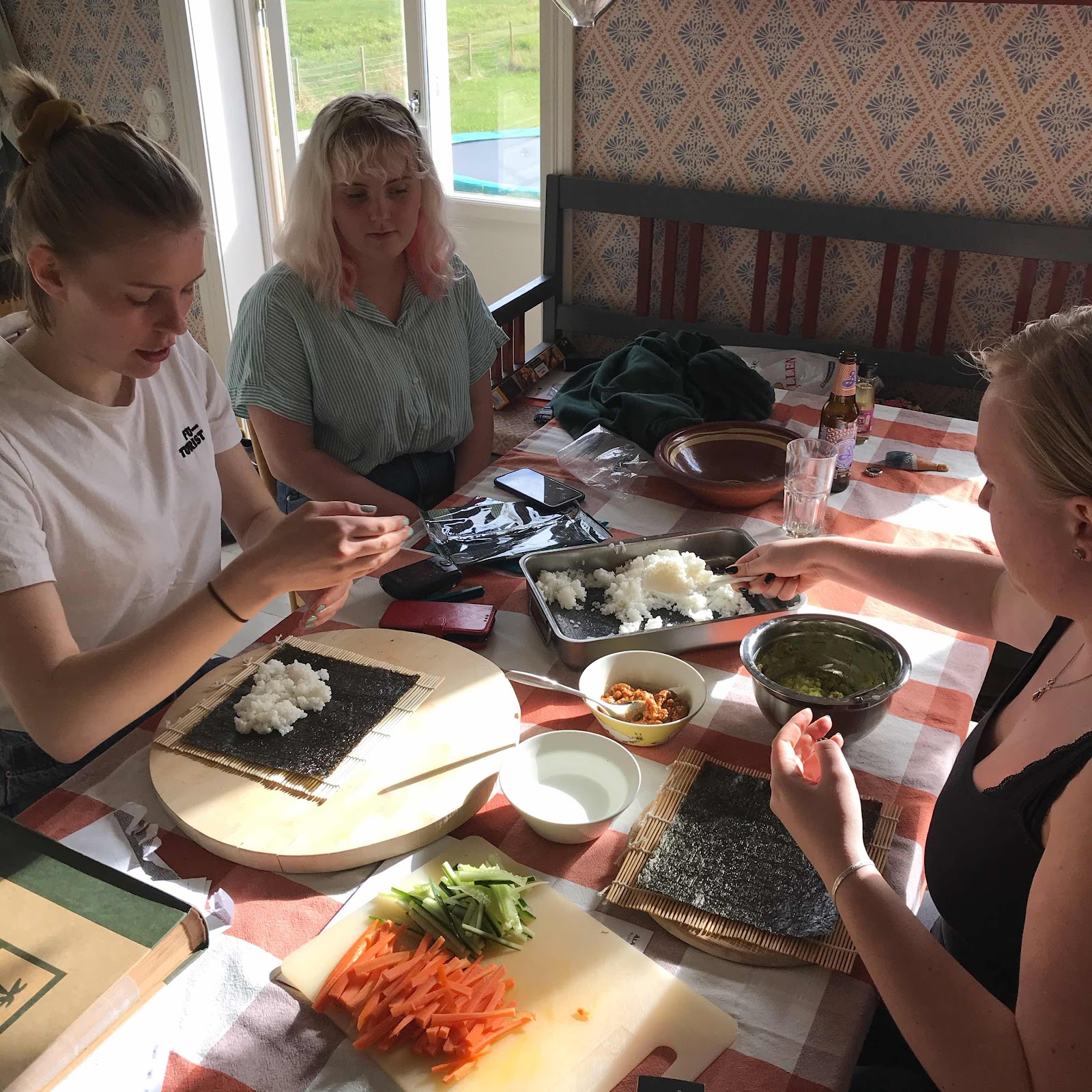 Plötsligt fylldes köket av unga damer och en sushiverkstad uppstod. Middag före den traditionsenliga eurovision-natten, när det ska tyckas, kommenteras och ätas glass.