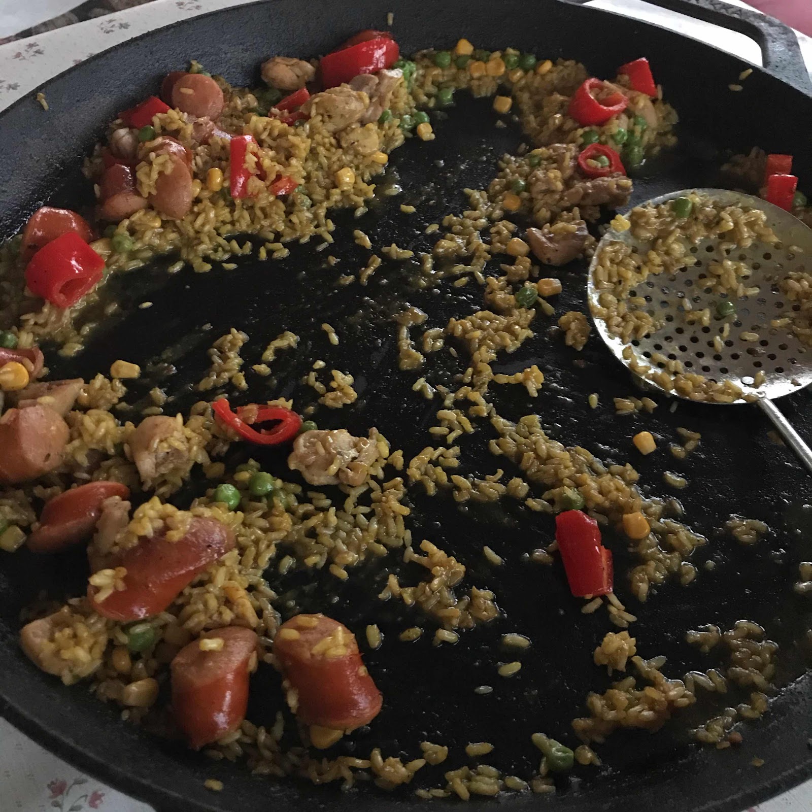 Så - vi kokade paellan i två timmar utan att riset blev riktigt färdigt. Slutsats: vi måste ha ett lock till paellapannan.