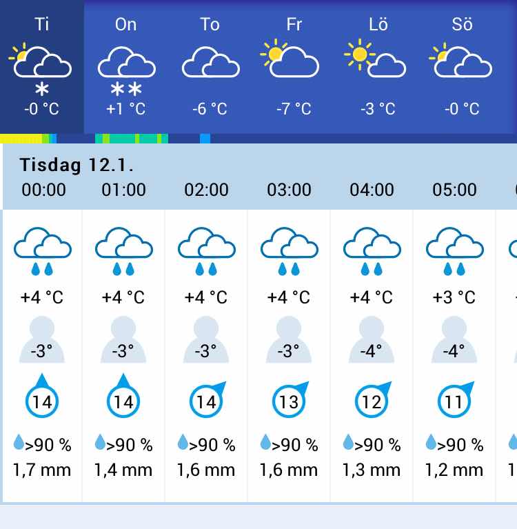 Imorgon: samma väder men övergår till snöfall. Jahopp.