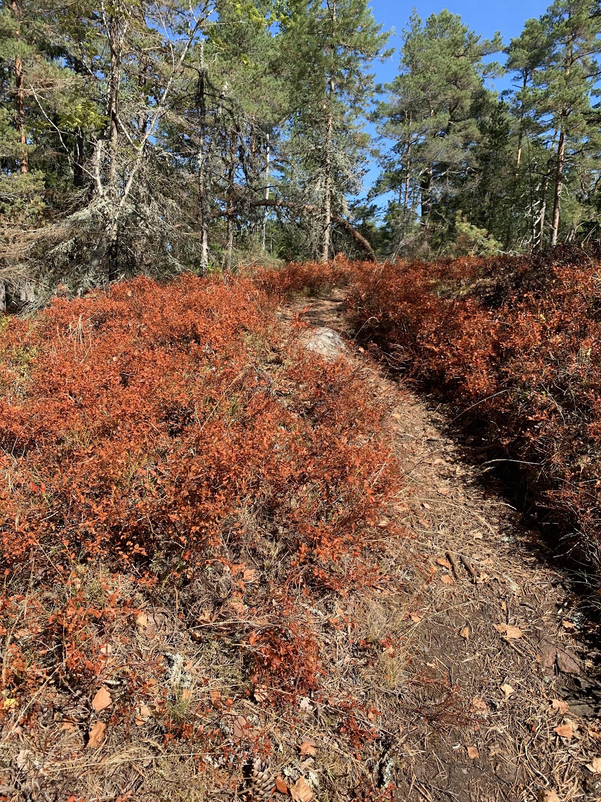 Så vansinnigt torrt. Nästan bränt. Blåbärsrisen är brinnande orange som en lönn om hösten. Björkarnas löv ser ut som lövkärvarna man gav till fåren om vintern.