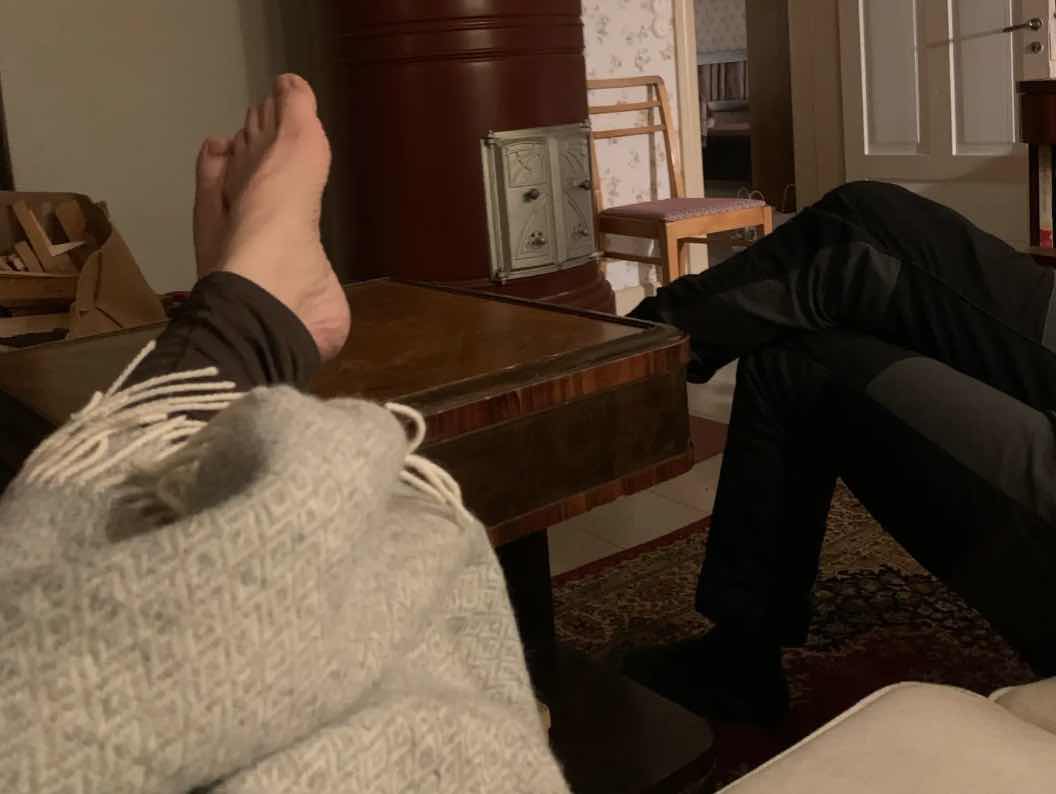 Kvällarna? M och jag sitter i varsitt soffhörn med varsin skärm och njuter av brasan och att inte behöva göra nåt särskilt. Trevligt. Vardag, liksom.