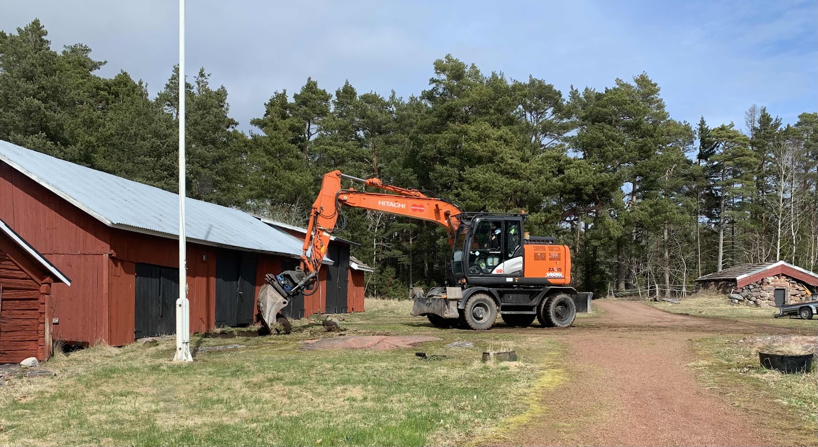 Dagens underhållning på Fridhem: Stora maskiner. I samråd med Farstafaster hade vi beställt hyvling av vägen från Fridhem ner till stranden och hennes stuga. Vädret tillät att Hector och jag satt på kökstrappan och tittade på spektaklet. Kul att titta på när folk jobbar, framför allt folk som gör svåra grejer och uppenbarligen vet vad dom gör, som att köra grävmaskin.