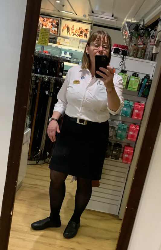 Hade hittat en kjol (dvs en som passade, det fanns massor) i klädförråret och var orimligt taggad på att ha den på mej nu när jag äntligen var tillbaka i butiken. Tog rentav mod till mej (och konsultation med pålitliga kollegor) och stoppade in skjortan. Midjan är ju inte vad den varit, men det behöver vi väl inte tänka så mycket på? Kul ändå. Gillar att ha kjol.