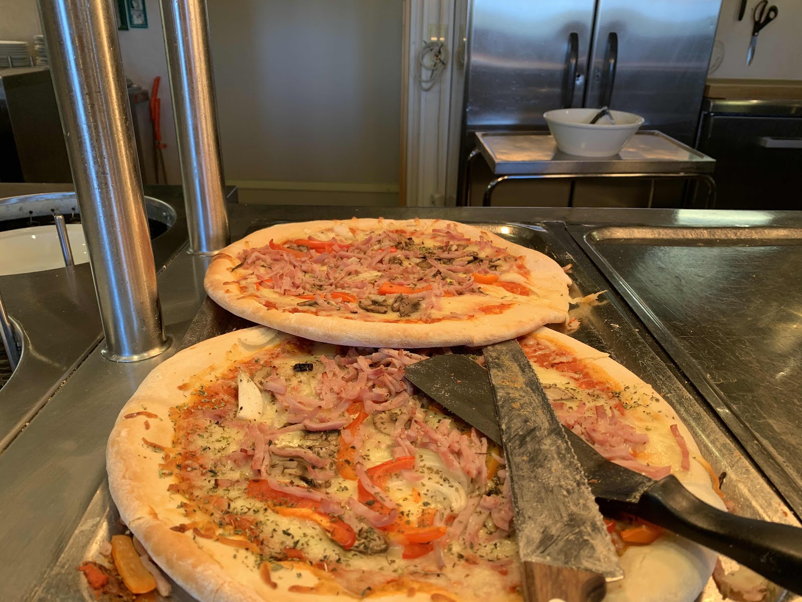 Dagens lunch i mässen: pizza. Inte alls dumt, men pizzeria Fridhem spelar i en annan division, kan man säja.