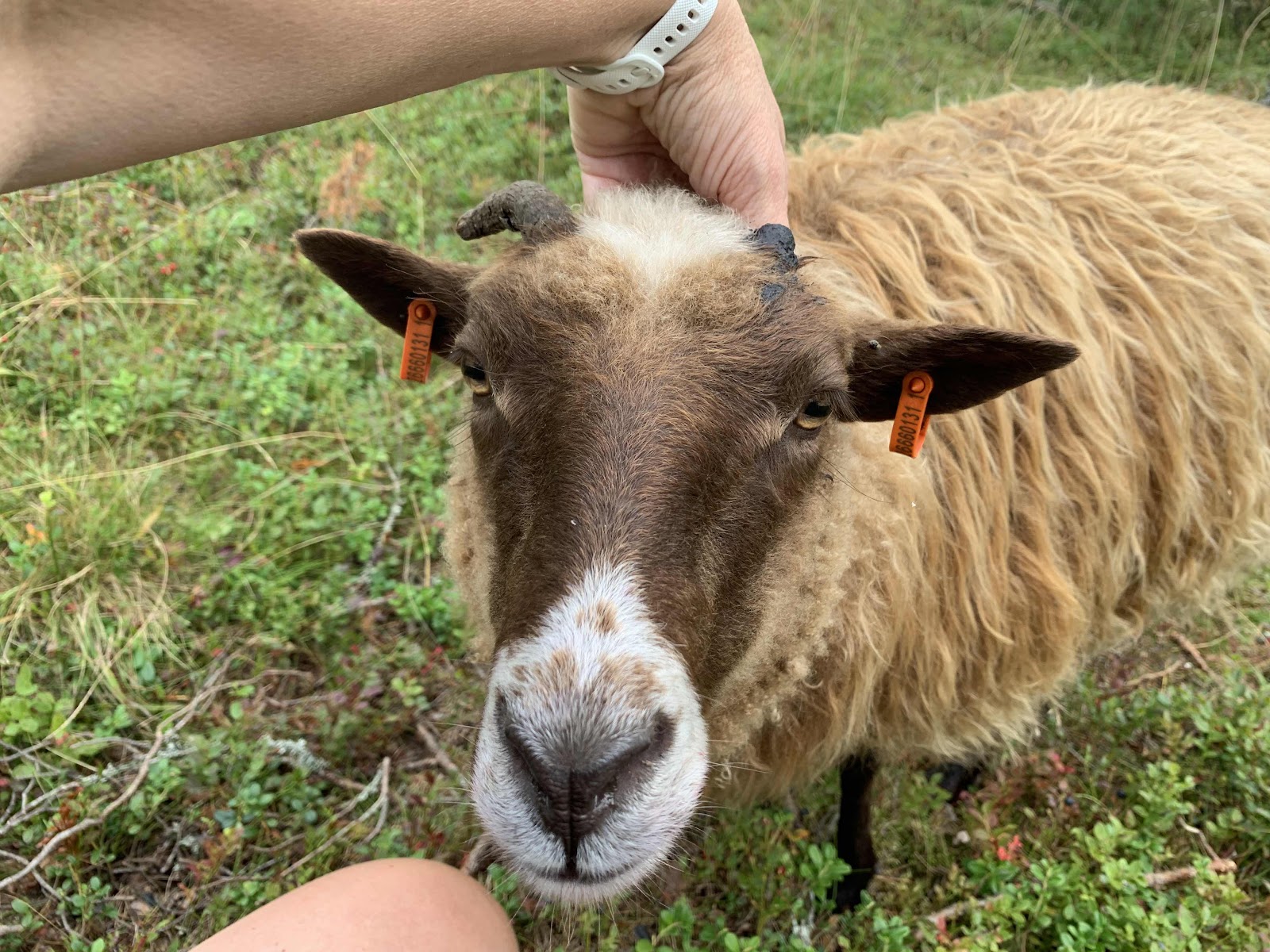 Den här fårgeten (ett får som tror hon är en get, reds anm) har lyckats bryta av ett horn. Det var en rätt blodig historia och hon har fått nån slags plåstersmörja på stumpen för att inte dra till sig flugsvärmar.