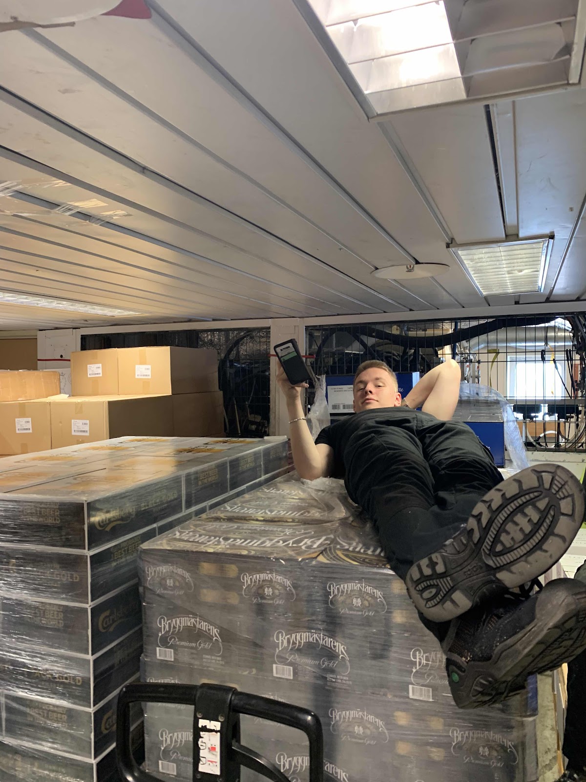 Där uppe på ölpallen, strax under taket, hittade jag en kollega som tydligen hade rast.