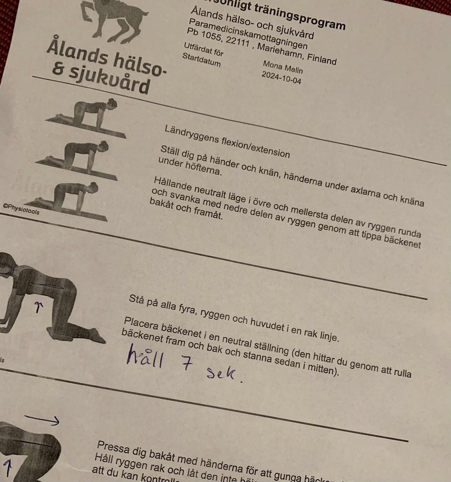 Har nu en samling övningar som ser enkla ut men som kräver fullt fokus och att jag inte tänker på nåt annat än hur jag vinklar bäckenet. Har lovat mej själv att vara duktig och göra övningarna minst en gång om dagen. Ska i övrigt leva och träna som vanligt men hela tiden vara medveten om hur jag går och står och lyfter. Vi ser hur det går.