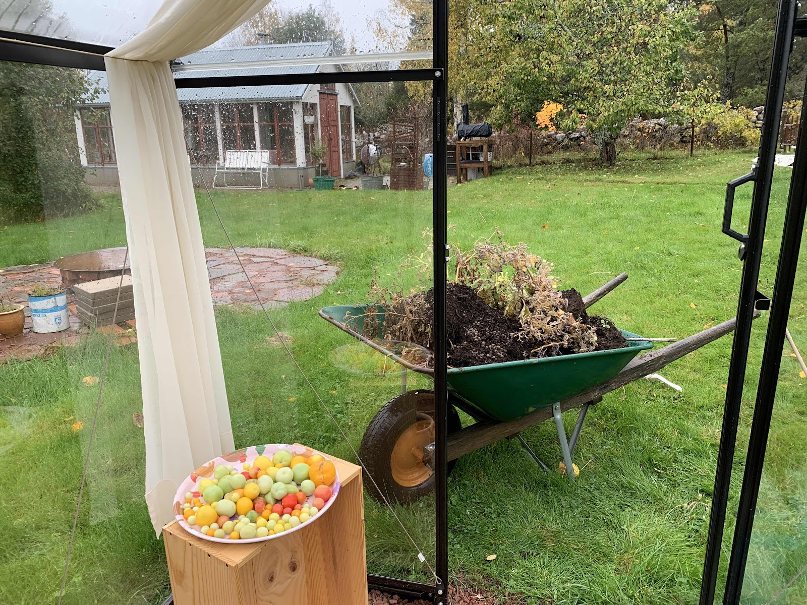 Blev liiite mindre skyfall framåt eftermiddagen, så tog tag i ett gäng husmorssysslor: tömde jord ut krukor i växthuset (blev halvklart), hängde upp getternas saltsten på regnfri plats, satte några innerfönster (två) på plats i Bastun. Förberedde middag tills maken kom hem (jo, jag lagar mat ibland, framför allt när det inte är muurikkaväder).