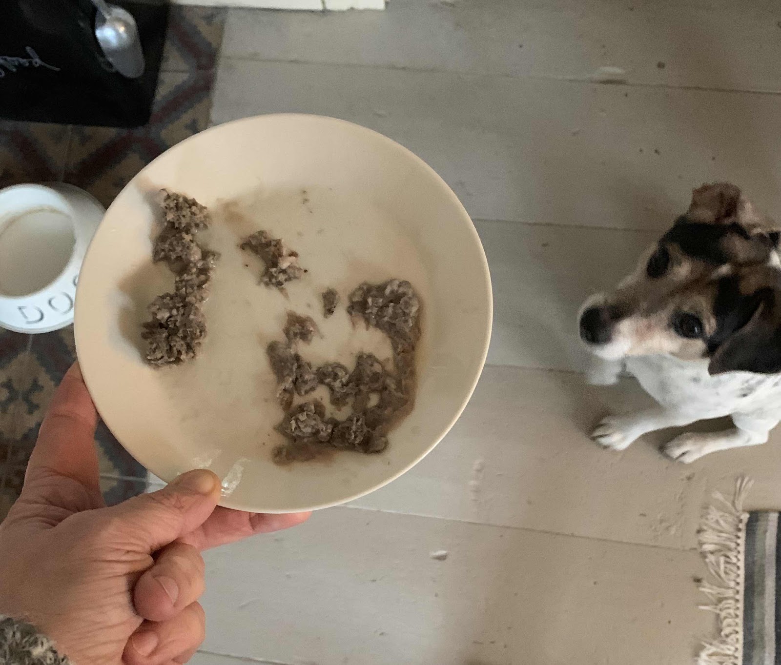 Hunden är så ivrig att tassarna vibrerar. Det luktar vidrigt. HUR kan nötvom te sig så gott?
