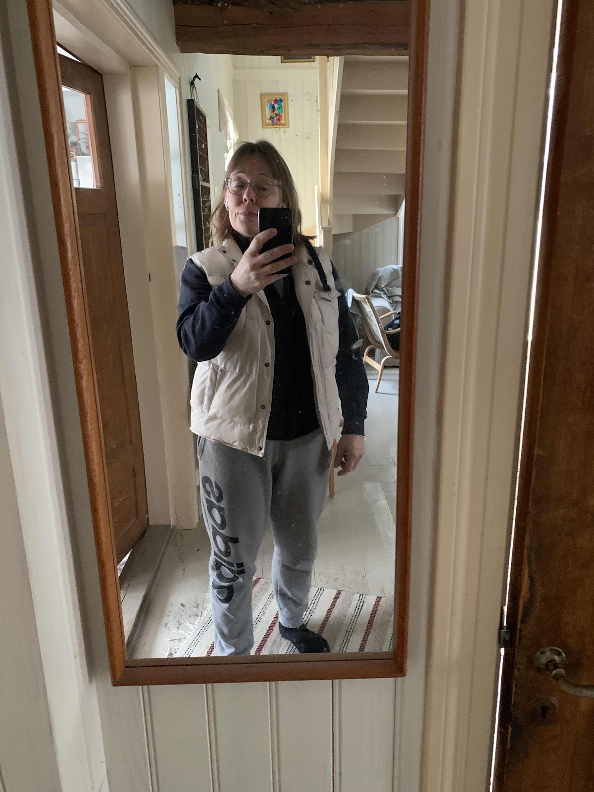 Outfit of the day: Mjukisbyxor norpade ur Storasysters emmauskasse. Tisha från Stadium Outlet, egentligen rätt snygg om den är ren. Hoodie från f d arbetsplats, den bekvämaste som finns. Dunväst som varit ridväst som blivit träningsväst o dyl. Kompletteras med M’s gummistövlar när jag går ut med julgranspyntet.