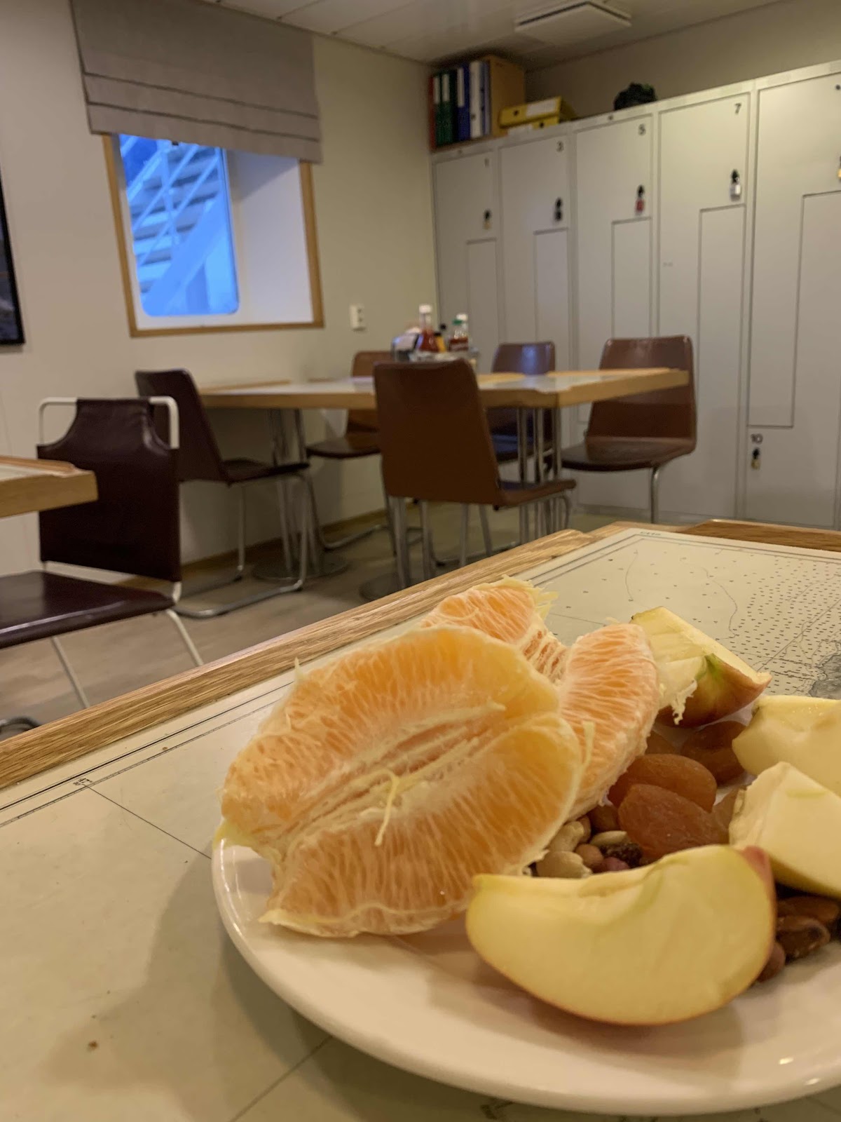 Äter frukt och dricker vatten mellan varven. Och kaffe.