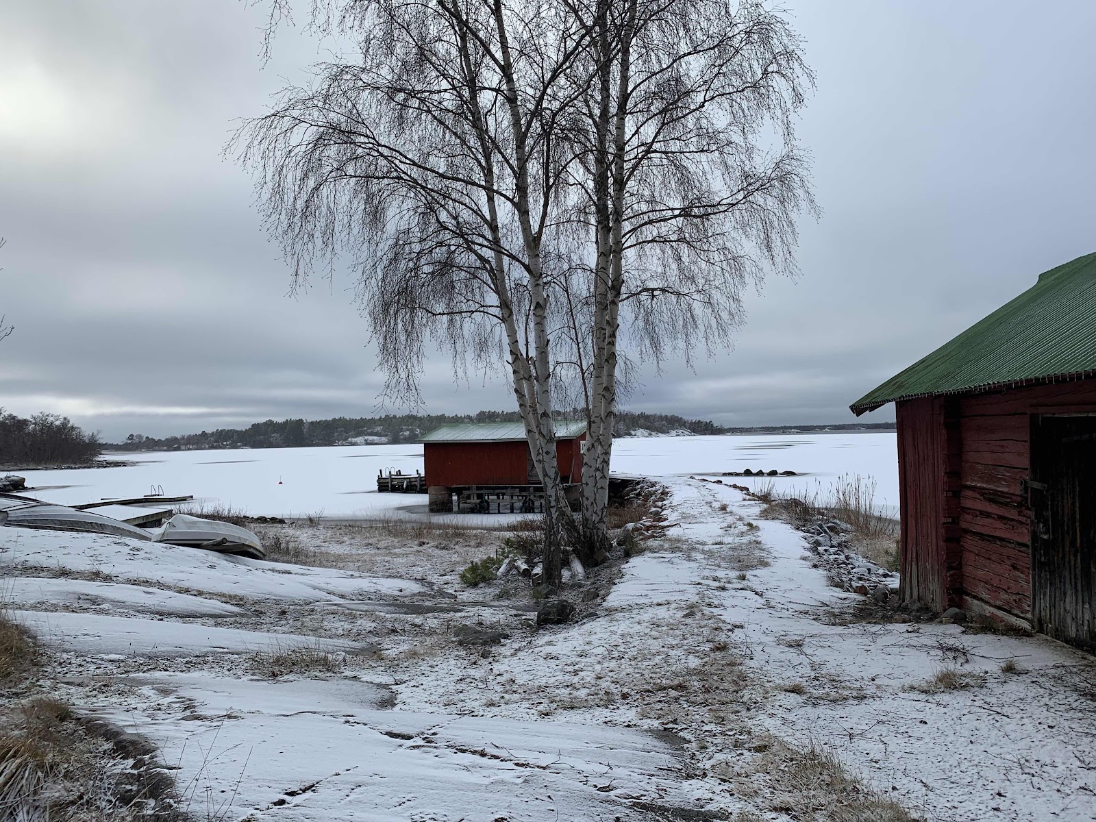 En halv centimeter snö gör att det blir vinterfint utan att det blir besvärligt. Det gillar vi. Vi (jag) är också lite förvånade att hitta is på vattnet. När kom den?