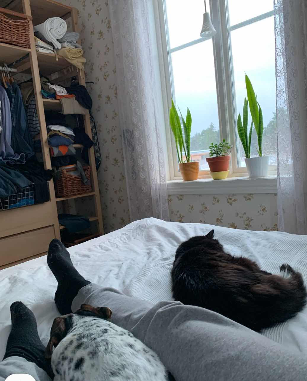 Inte många knop första dagen hemma nej. Horisontalläge det mesta av dagen med korta avbrott för förberedande av väggbygge eller intag av mat/kaffe. Fint vinterväder ute men nähepp, här görs inga utflykter om det inte är tvunget. Och det var det inte.
