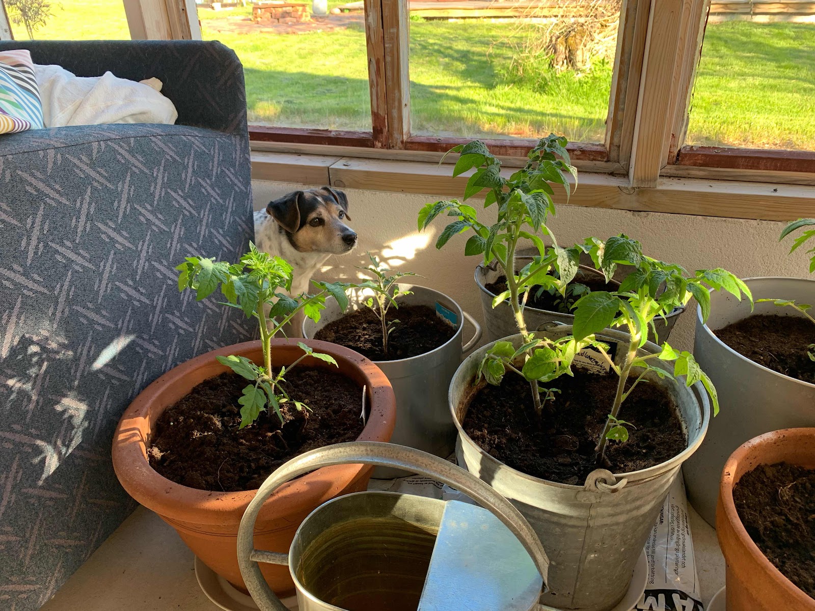 Låt mej illustrera dagen med en hund som Absolut Inte försöker tugga i sig som små lapparna som identifierar tomatplantorna. Helt oskyldig är han. Inte över huvud taget.