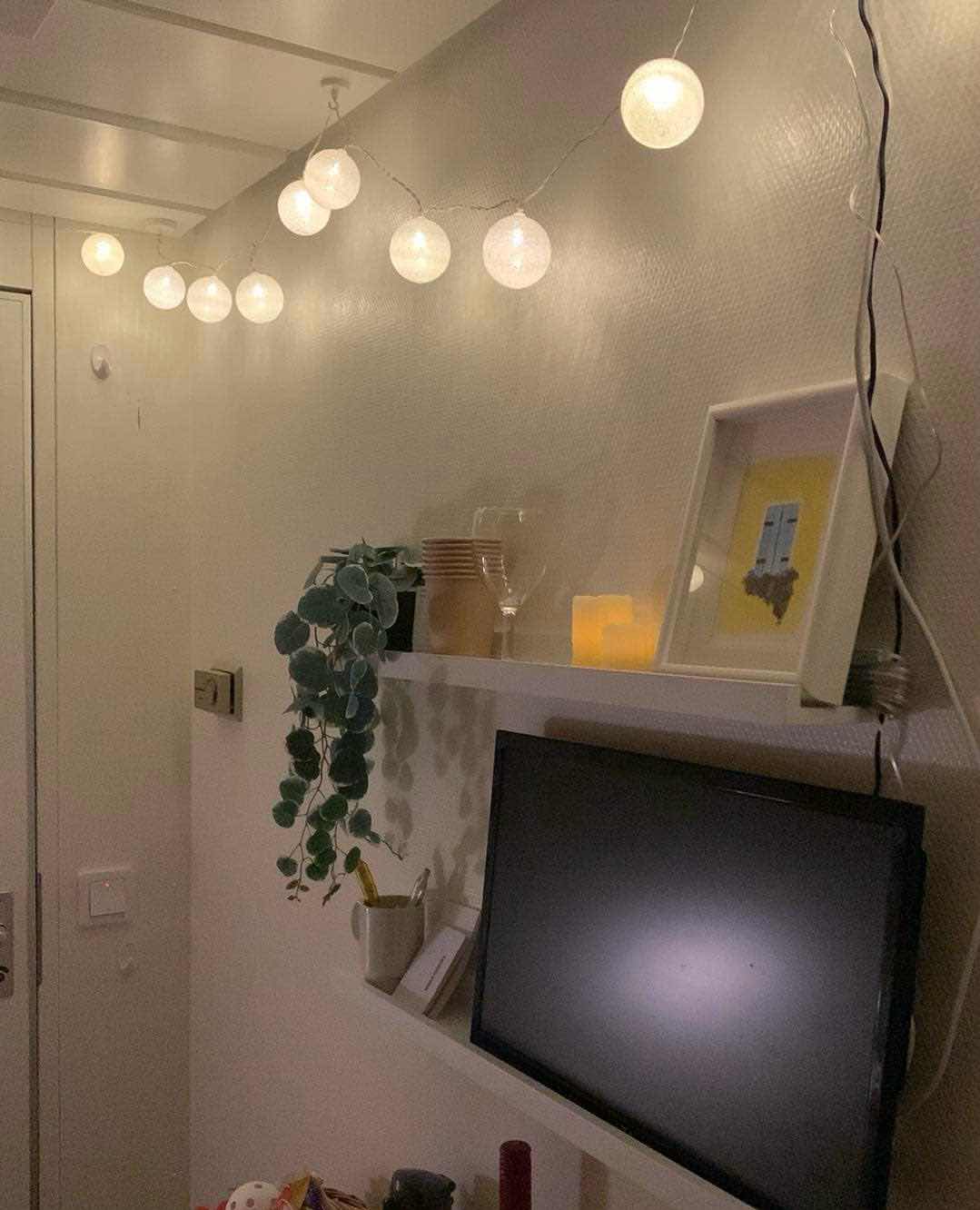Har pysslat lite så det ska vara lite hemtrevligt, med ljusslinga och liten tavla ned Storasysters akvarell. Har cirka tre kvadratmeter golvyta, men det funkar förvånansvärt bra.