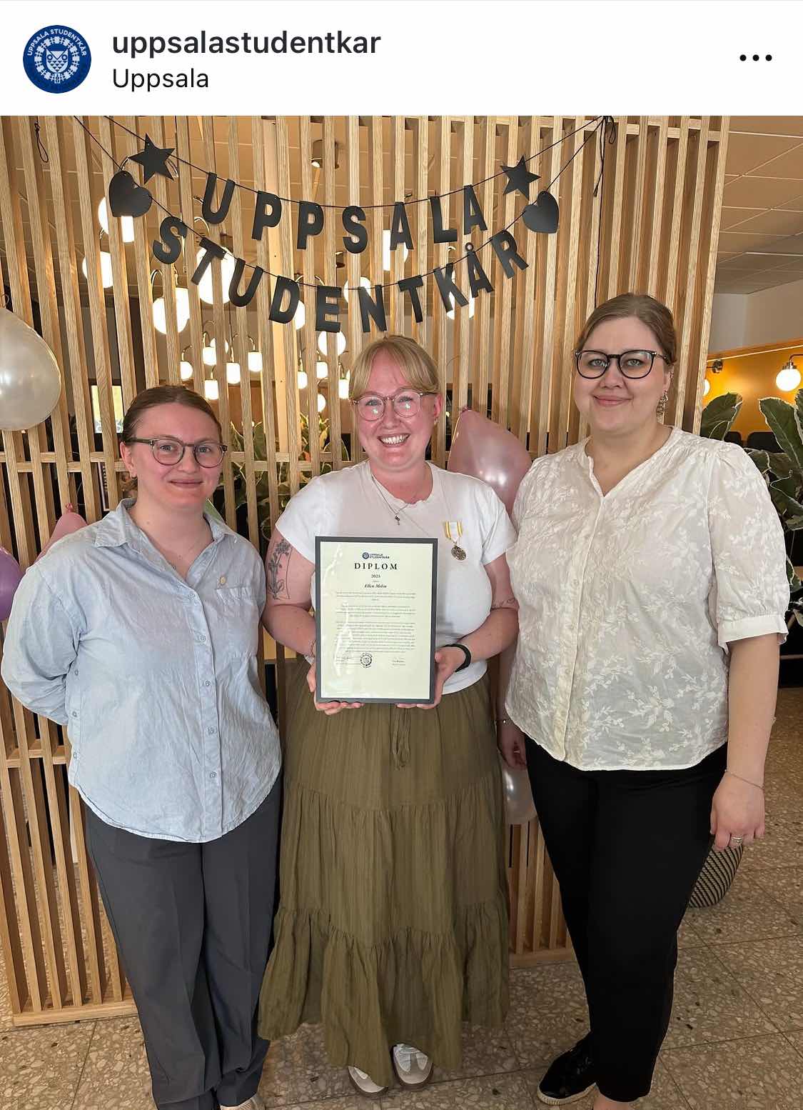 Hon Uppsalastudenten har tilldelats diplom och medalj för sin insats som elevrepresentant. Mycket stolta föräldrar blir lite stjärnögda.