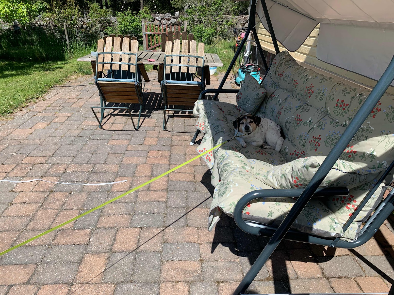 Jorå, det blev tak på hammocken. Dagens provsittningskommitté var så nöjd att han måste lyftas ur provningen för att komma ut på promenad.